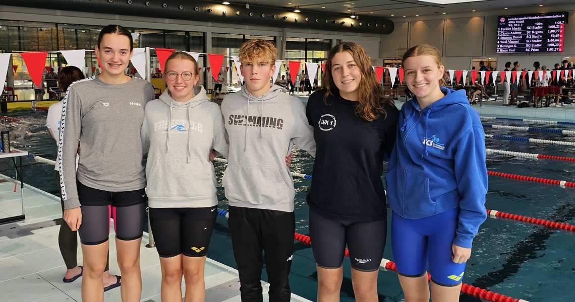Helena Gäntzle, Heike Lanzl, Aleksei Malikoski, Lara Wachtel und Luisa Wachtel schwimmen beim Ravensburger Sprintpokal auf Platz 1