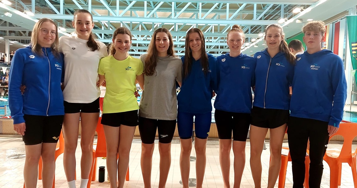 Für den Schwimmclub Schwandorf waren mit Helena Gäntzle, Heike Lanzl, Ida Matthes, Pauline Heimrath, Emma Knerer, Emily Rödl, Johanna Schoyerer und Aleksei Malikoski (am Bild von links nach rechts) so viele Aktive wie nie zuvor bei den Süddeutschen am Start. Mit Bronze für Platz 3 über 100 m Schmetterling durch Aleksei Malikoski und über 50 m Rücken durch Heike Lanzl konnte sich der Schwimmclub nach den grandiosen Erfolgen aus dem Vorjahr erneut glänzend in Szene setzen. Zudem konnte sich Aleksei Malikoski für das Jugendfinale über 100 m Schmetterling qualifizieren. Helena Gäntzle und wiederum Aleksei Malikoski überzeugten außerdem mit neuen Vereinsrekorden über 400 m Freistil (4:50,73 Minuten) bzw. 100 m Schmetterling (0:59,46 Minuten). Mit dieser Zeit schaffte es Aleksei Malikoski passend zum Ende des Qualifikationszeitraums, die Normen für die Deutschen Jahrgangsmeisterschaften Anfang Juni um zwei Zehntel zu unterbieten, sodass er dann dort in Berlin den Schwimmclub Schwandorf vertreten wird.